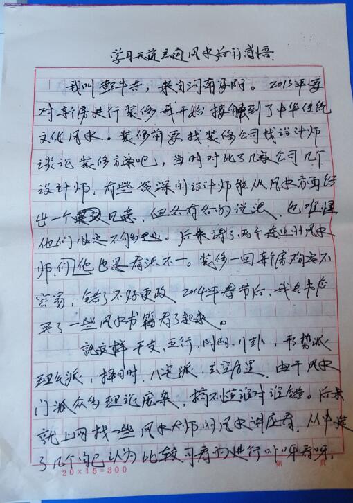 我叫彭牛吉,来自河南安阳。2013年要对新房进行装修,我开始接触到了中华传统文化风水。装修前要找装修公司找设计师谈论装修方案吧,当时对比了几家公司几个设计师。有些资深设计师能从风水方面给出一个建议。但各有各的说法。也难怪他们必定不够专业。后来请了两个专业的风水师。他们也是看法不一。装修一回新房确实不容易。错了不好改。2014年春节后,我去书店买了一些风水书籍看了起来。