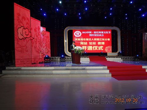 西楚网讯:9月20日上午,作为2012中国·宿迁西楚文化节暨经贸洽谈会的重要活动之一,“天南海北宿迁人祝福江东父老”网站、论坛、微博启动仪式,在宿迁广电总台演播大厅隆重举行。宿迁市委常委、宣传部长赵正兰出席开通仪式。江苏大宇环境设计有限公司(天道玄通堪舆文化传播有限公司)董事长梁光耀老师现场接受记者采访“在外乡这么多年,心中一直对家乡有一份牵挂。我们时刻都在想着能够回到家乡,为家乡的发展奉献自己的一份力量,此次西楚文化节举办,我们也是积极响应市委市的。回来之后看到家乡的巨大变化,感到非常欣慰,祝愿此次西楚文化节取得成功!”江苏大宇环境设计有限公司梁光耀老师说。最后,宿迁天南海北宿迁人祝福江东父老”活动正式启动市委常委、宣传部长赵正兰启动“天南海北宿迁人祝福江东父老”网站,并观看了“天南海北宿迁人祝福江东父老”的精彩视频。
